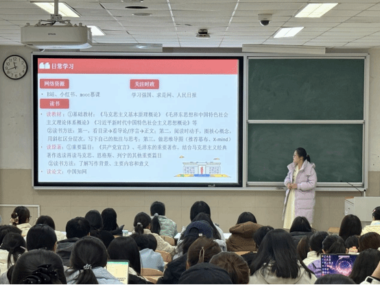 活动开始后,首先由思政2202班推免至华中师范大学的刘悦昕同学、思政2203班推免至西北大学的郝一霓同学、思政2202班推免至北京邮电大学的郝婉君同学为大家分享关于推免流程与专业学习的经验。关于推免流程,她们从本校资格申请、推免系统填报、复试录取等关键流程出发,再到志愿“冲稳保”搭配、材料准备技巧及系统时限把控等实用经验的分享,为2025级同学清晰拆解推免核心要点。关于专业学习经验,她们以大学四年学习规划为整体方向,从课程学习、科创赛事、英语提升、科研实践以及个人学习经验四个方面为大家分享。从不同维度、不同视角全面地向同学们展开描述,向同学们传授自己在提升专业能力、提高学习效率方面的经验。