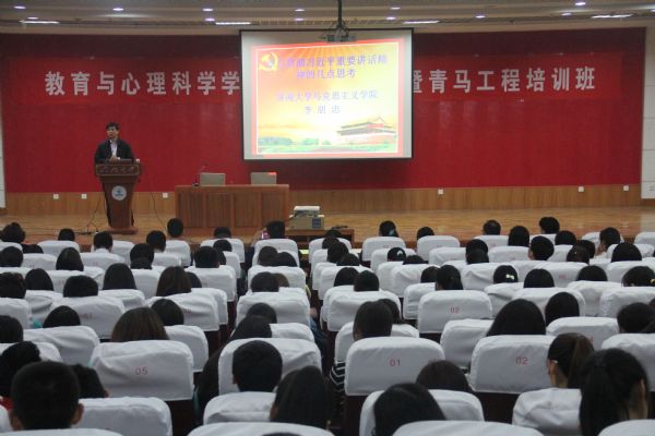 教心学院全体教工党员、学生党员及入党积极分子做了题为《学习贯彻习近平总书记重要讲话精神的几点思考》的专场报告会。共计300多人听取了李朋忠老师的报告。